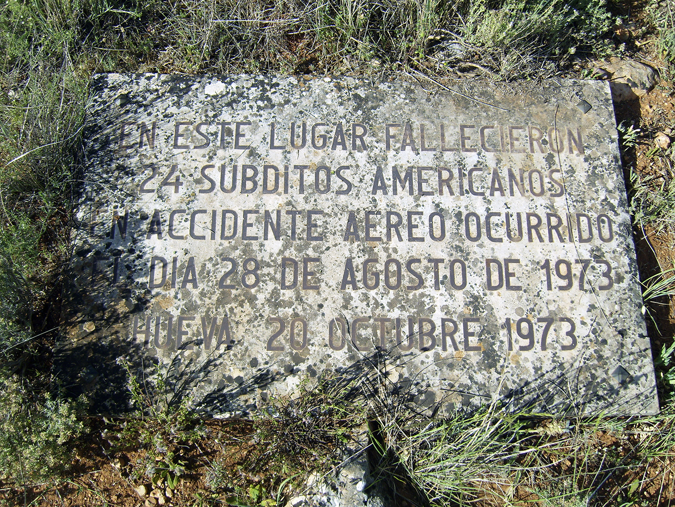 | Lapida conmemorativa que recuerda a los fallecidos en el accidente. Se puede leer en ella: "En este lugar fallecieron 24 súbditos americanos en accidente aéreo ocurrido el día 28 de Agosto de 1.973. Hueva 20 Octubre 1.973" | ||||||||||||||||||||||||||||||||||||||||||||